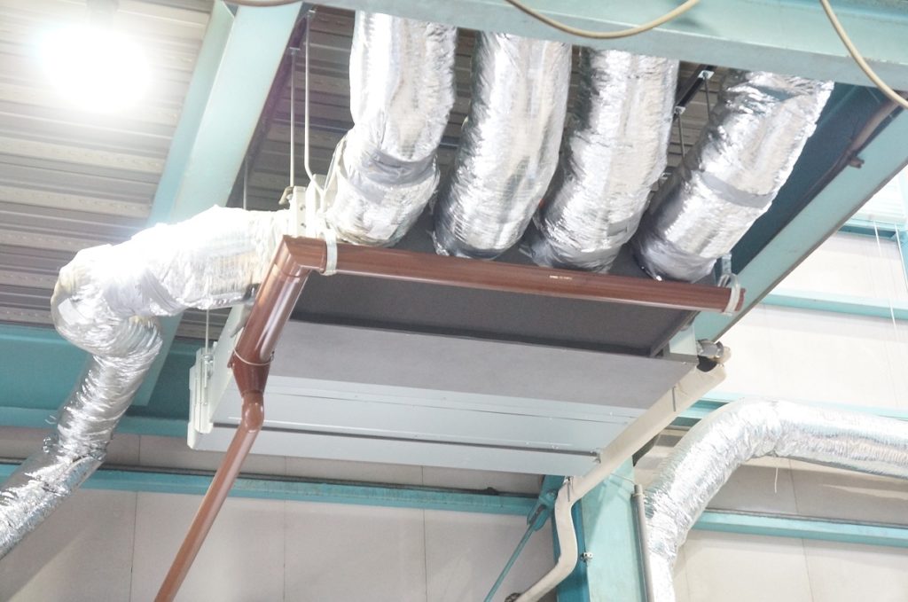 イシバシでは天井に大きなエアコンを設置し、何本もの管を工場内の各所に配置し、エアコンの涼しい風を直に感じられるようにしています。