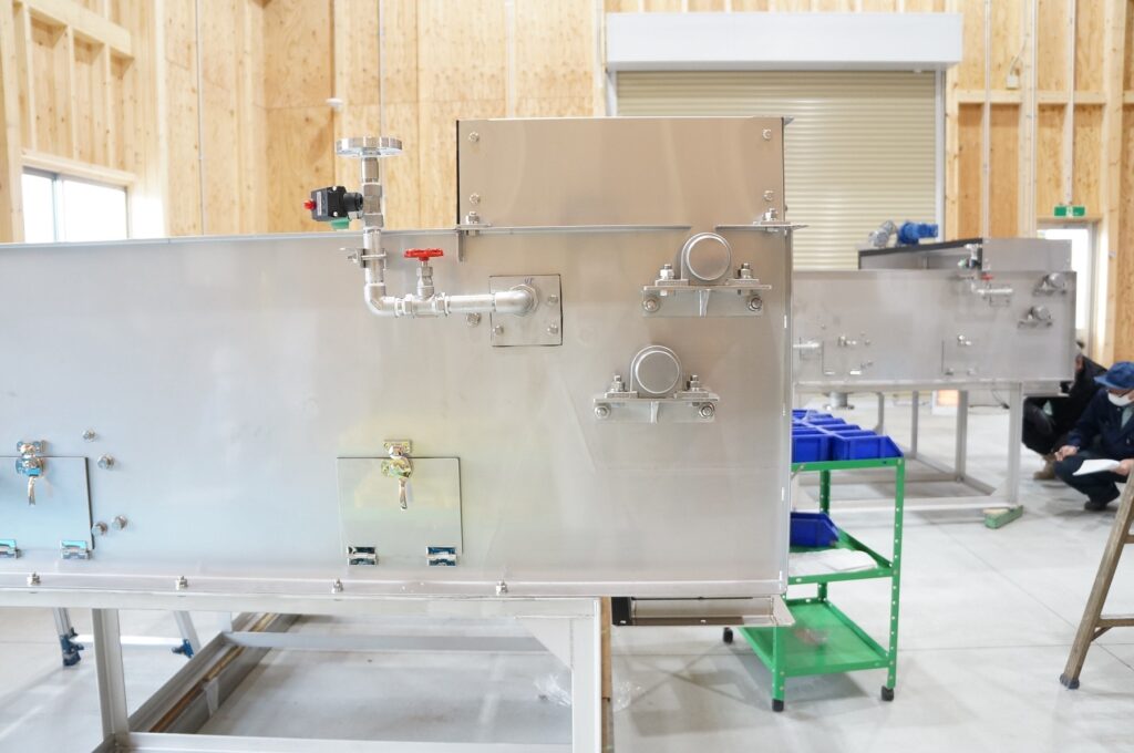 現在、新工場で製作されているのは水槽と架台です。先月はまだ溶接している段階でしたが、2月の撮影時にはほぼ完成していました。こうして横に設置してみるるとなかなかの大きさです。