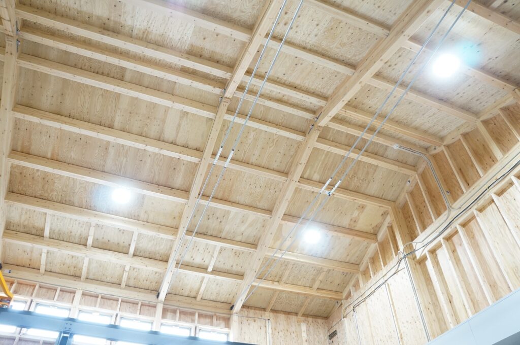 新工場の建設には木材を使用しました。「鉄骨構造ではなくて大丈夫なの?」と思われるかもしれませんが、天井にある数本の鉄線が強度を上げているので、木造でもかなりの強度があります。また、鉄骨で建設するよりも工期が短く、着工からすぐに完成できる点も大きなメリットです。完成したばかりなので工場内は木のいい香りがします。