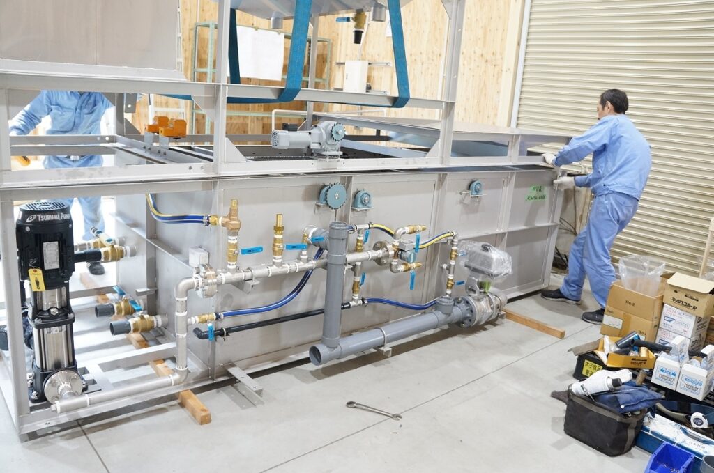 大きな脱水機と水槽、組立ではホイストクレーンが活躍しています