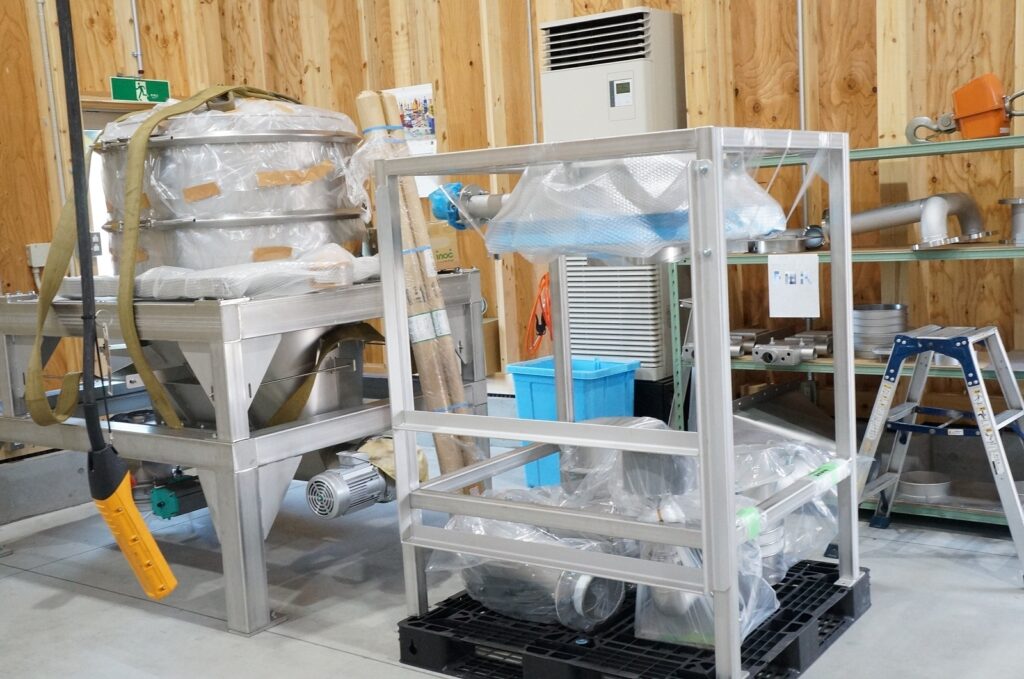 2月に竣工した新工場では最終的な組み立てや梱包作業が進められています。こちらは大手菓子メーカー向けスクリューフィーダーやホッパー、架台を製作いたしました。この撮影の後トラックに積まれ、搬送されていきました。無事に発送できて一安心です。