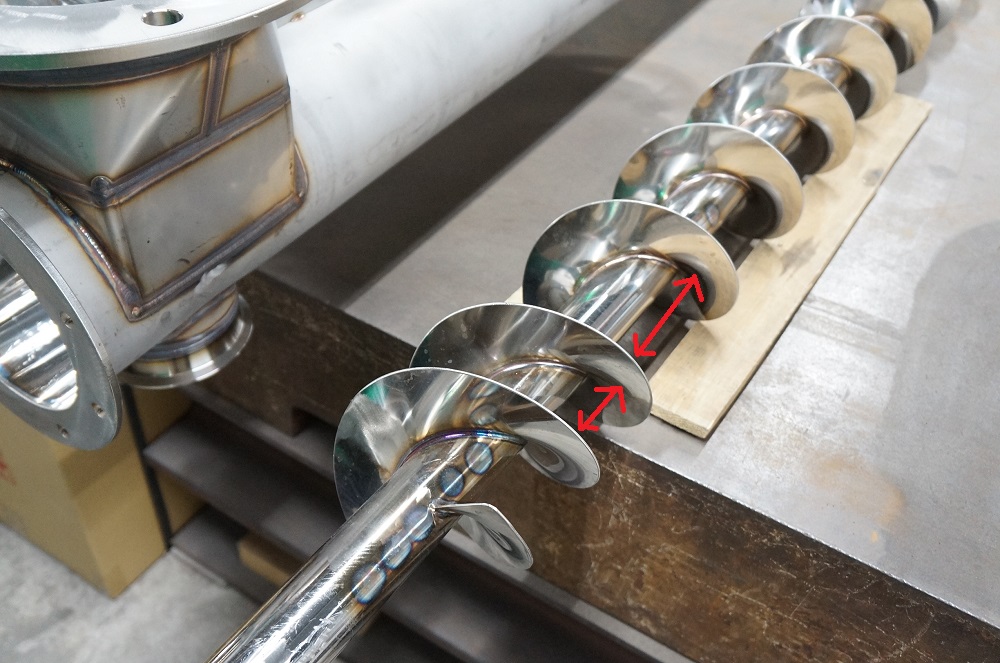 このスクリューフィーダーは端の部分にスクリューの羽根を1枚増やしています。ピッチが狭くなっていることがおわかりいただけるでしょうか?こうすることでダマになっている粉が砕かやすくなるのです。