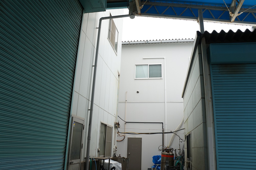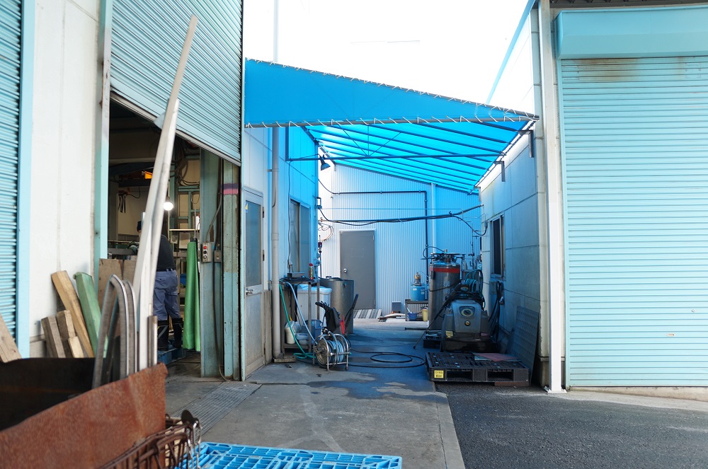 工場と倉庫の間のスペースに屋根の設置工事が行われ、この度完成いたしました。これより雨風をしのげて、作業スペースが増えました。