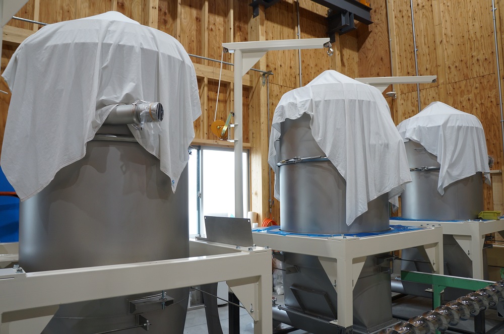 この日は新工場では納品待ちのホッパーが並んでいました。こちらは大手製菓メーカーに納品予定のホッパーです。横幅1200mmと、ホッパー本体も大きめですが、高さもフィルターケースと合わせると2400mm以上あり、大容量の粉体を貯留できるホッパーに仕上がっています。