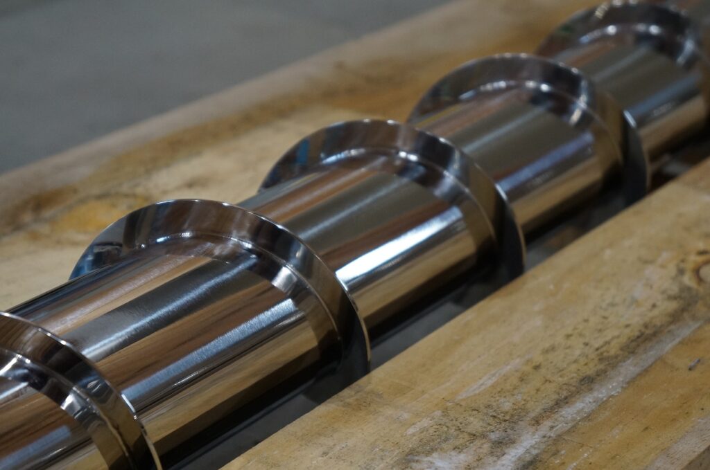 羽根がとても短いスクリューフィーダー。バフ研磨を終え、組み立てているところです。こちらは化学メーカーに納品予定で、プラスチックの原料輸送に使われます。