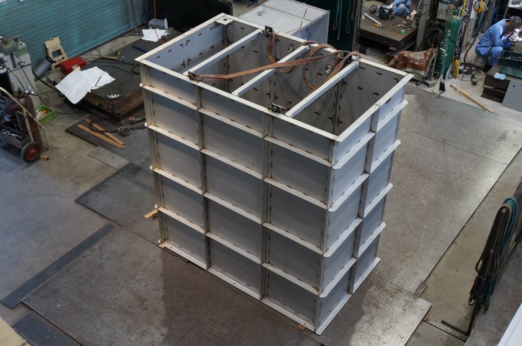 溶接工場では大きな水槽の溶接が進んでいました。全周溶接といって、水漏れを防ぐために外側から溶接しています。排水処理に使われる水槽で、ちょっとした個室のようにも見えますが…