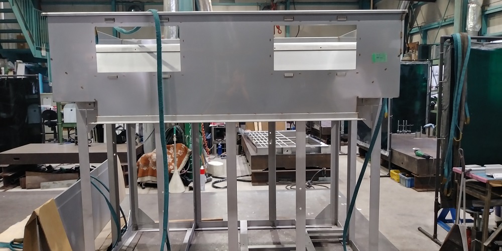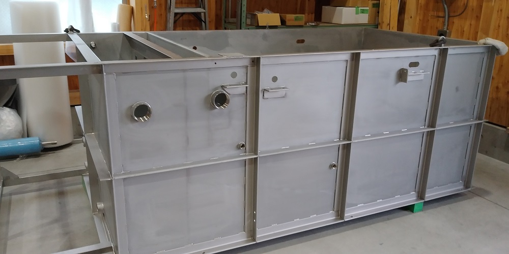 組立前のこちらの水槽とともに製紙工場に納品予定です。ステンレス製品は水分に強いことから、製紙工場をはじめとした各種水処理設備でも活用されています。