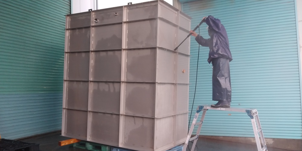 先月ご紹介しました個室のような大きな水槽は溶接を終え、今は焼け落としや洗浄をしているところです。洗浄は大量の水を使うので屋外で作業しています。