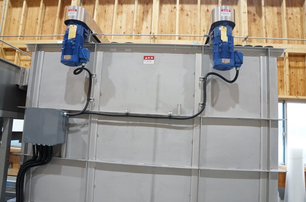 その横にはさらに大きく深い水槽もあります。この水槽は排水処理に使われるもので、青いタンクの中には薬液が入っています。水槽の中に薬液が投入されると、水中の浮遊物が分離されて固められていきます。余分な浮遊物を取り除いた水が先ほどの水槽に流れていくという仕組みです。