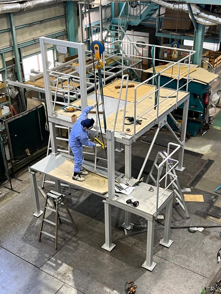 製麺工場に納品するステンレス架台です。横4000mm幅2900mm手摺り高さ4300mm。高さのある架台は、はしごや階段を使って昇降できるようになっています。このような架台はホッパーを支えるだけでなく、人が乗って作業できる構造になっていることから「ステージ架台」と呼ばれます。イシバシでは最大で6500mmステージ架台を納品できます。