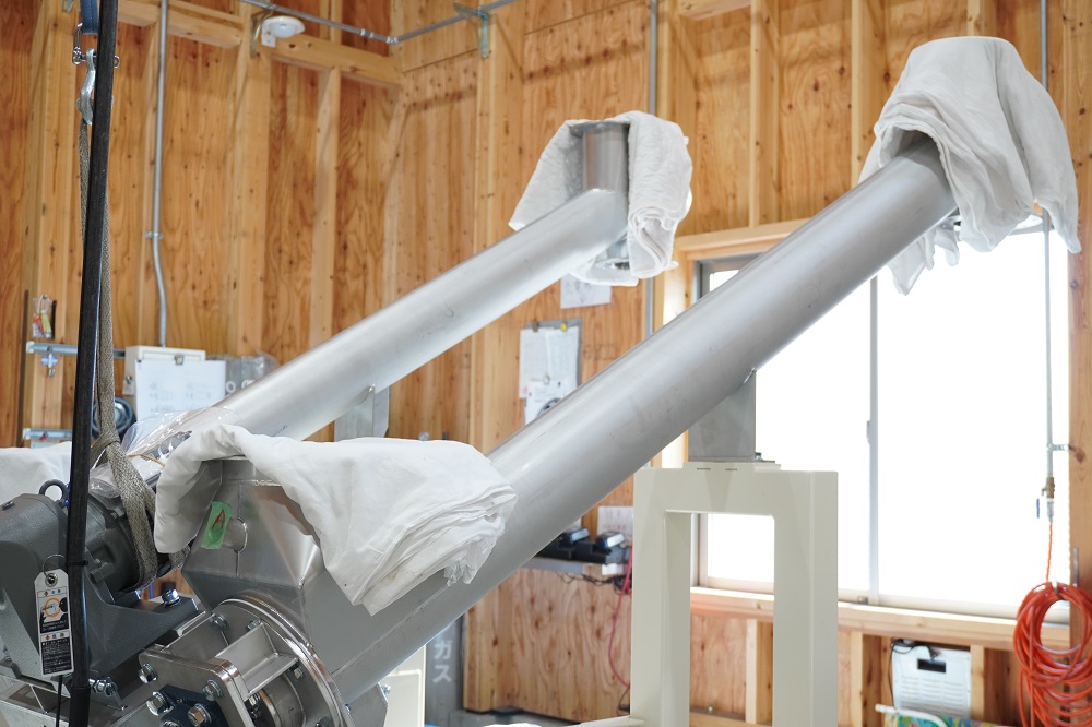 こちらは製麺工場に納品予定のスクリューフィーダーです。イシバシで製作しているスクリューフィーダーの多くは水平式のものですが、今回は傾斜しているタイプ。輸送する粉体の性質や目的に応じて水平タイプか傾斜タイプのいずれかを選んで製作できます。斜めになってもパイプをしっかりと支えられるよう、架台の形も特徴的ですね。