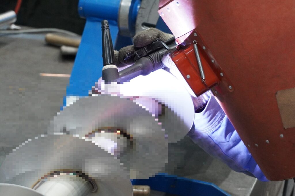 ちょうどスクリューフィーダーの溶接をしているところを撮影しました。羽根を点溶接(仮溶接)した後に、線溶接(本溶接)をしていきます。羽根を軸に沿うようにして溶接していきますが、どのように溶接していると思いますか?