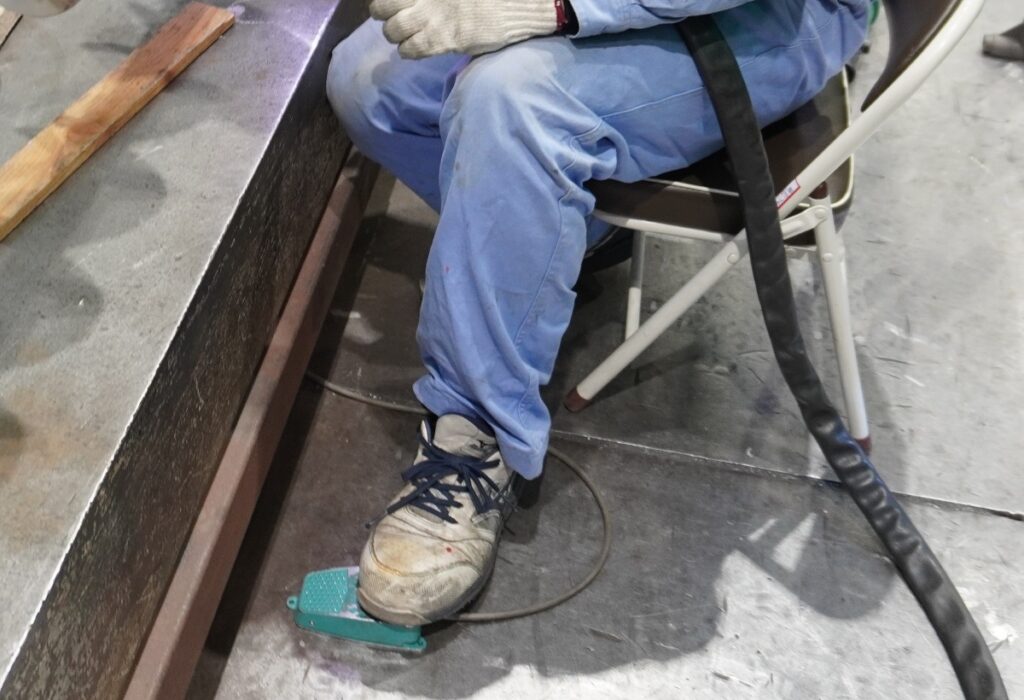 実は、機械操作でスクリューフィーダーを動かして溶接しています。足元のペダルを踏むと軸が回転し、離すと止まる仕組みです。これなら一定のペースで回転するので、片方の手で回したり溶接するスタッフがその都度移動したりするより、ムラなく丁寧な溶接ができますね。製作中の段階から、スクリューフィーダーはすでに回転しているのです。