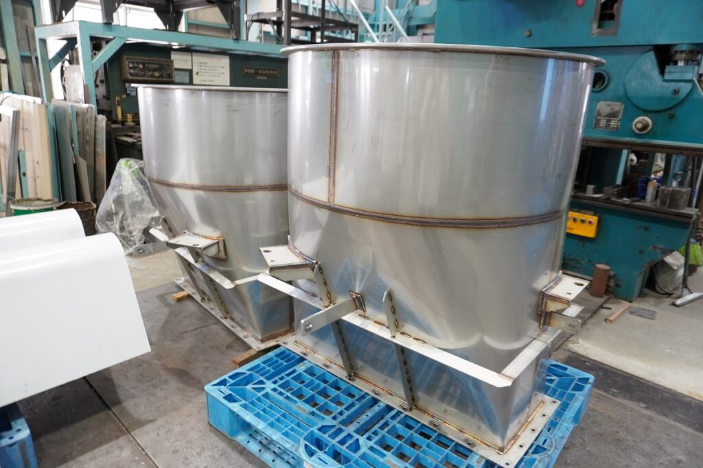 今回は食品メーカー様よりスクリューフィーダー、コーンホッパー、胴ホッパー、架台など、周辺機器も含めた食品機械一式を受注しました。