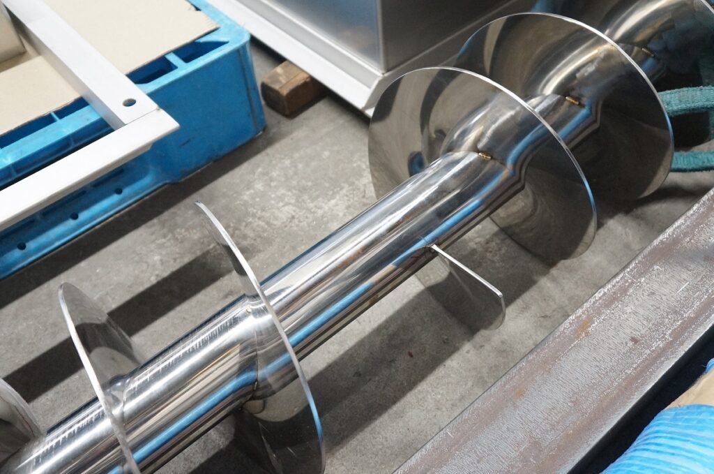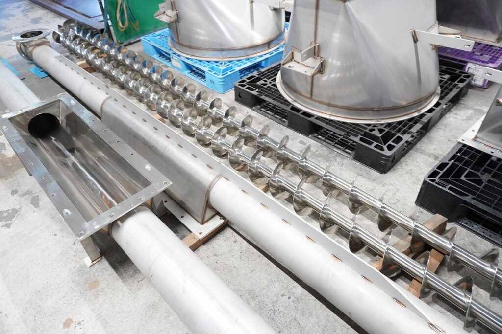 こちらは食品メーカーに納品予定のスクリューフィーダーです。ホッパーとともに受注しました。溶接を終えたばかりなので表面に溶接焼けという焦げた跡が残っていますが、ここから焼け落としという作業に進み、きれいに磨き上げていきます。