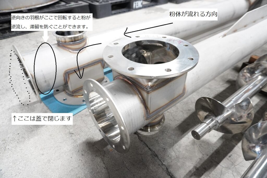 投入口から流れてきた粉はその後、下の出口に向かって流れます。横の穴には蓋がつくので、流れてきた粉が滞留してしまいます。これを防ぐためにあえて逆向きの羽根をつけることで粉を逆戻りさせ、下方に流れていくようにしているのです。
