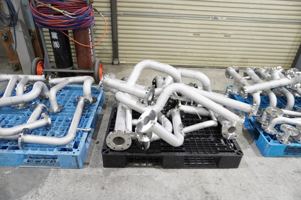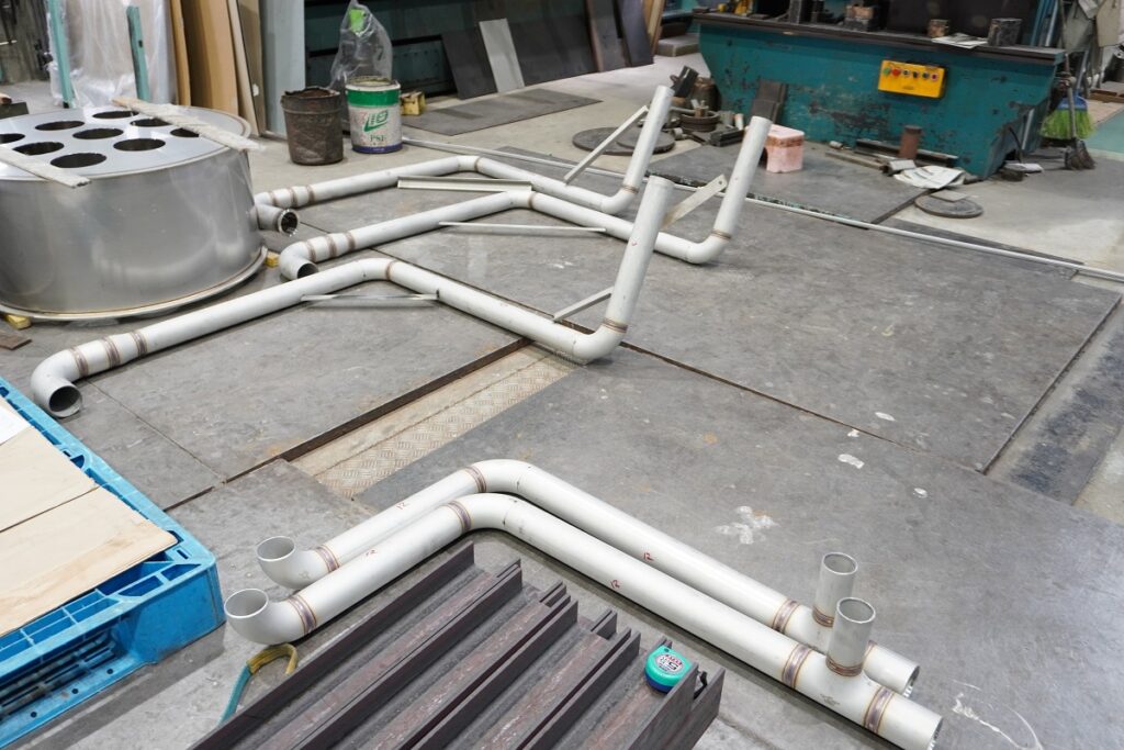 この日は工場内のいたるところにいろいろな形の配管が置かれていました。配管そのものは、水槽やホッパーほどの大きさはありませんが、大小さまざまな大きさで種類も形も多様なことから、大量受注となりました。