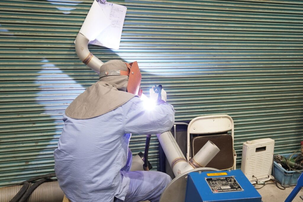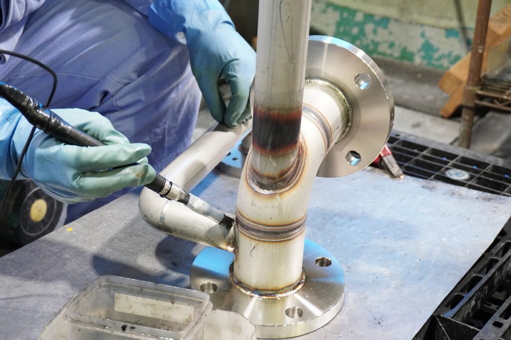 その横では、溶接を終えた配管をきれいにする「焼け落とし」という作業が行われていました。電解水を使って、焼けた跡をなぞるようにしてきれいにしています。