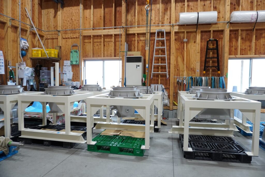今回はホッパースクリューフィーダーを含めて全部で23台もの食品機械を製作する大型案件となりました。6月上旬に納品できるよう、スタッフ総出で製作しています!