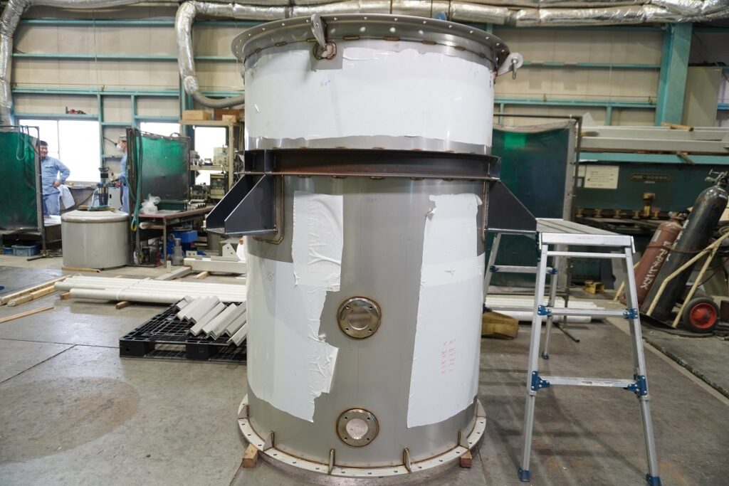 こちらは大手化学メーカーに納品するステンレス製タンクです。イシバシでは、小麦粉などの粉類の輸送に使われる食品機械を多く製造していますが、今回は化学原料に使用されるそうです。大きさは直径1200×高さ1800mmと見上げるほどの大きさのタンクを複数台受注したので、需要の高まりを感じます。