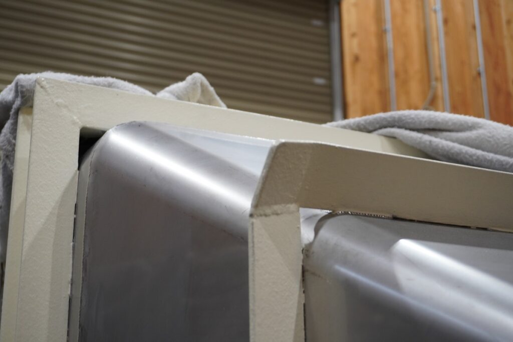 このホッパーも同様に、素材を補強するために鋼材で囲っています。変形しないよう、鋼材を溶接する位置も計算して溶接しています。