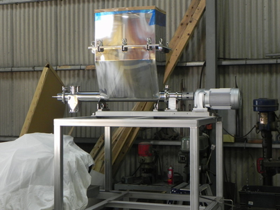 ステンレス製ステージ架台の上にあるホッパー(タンク)に小麦粉などの食品粉体物を入れます。そしてスクリューフィーダーが回転することで粉体物を次の工程へ送り出します。機械の素材はすべて衛生面に強いステンレスを使用しています。
