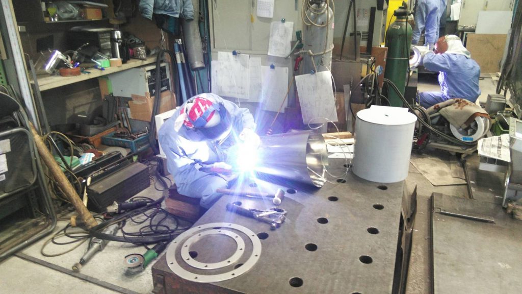 溶接工も溶接だけではなく、溶接が一人前になりましたら旋盤といった加工、そしてユニット化装置を完成させる組み立てなど、様々な業種にチャレンジすることができます。弊社の技術工は、一枚のステンレス板より製品ができるというモノづくりの醍醐味を味わうことができます。