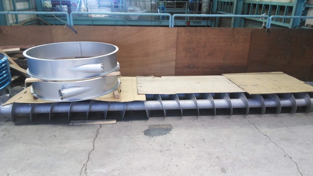 イシバシで製作する主力製品であるステンレス製スクリューフィーダーは、基本的な製品ではありますが、上の写真にあるような、左右で羽の向きが違う製作物など、多種多様な形状を製作しています。そのため、イシバシの溶接工は他社よりも技術の向上が早く、ステンレス製ホッパーやステンレス製品の工場としてはめずらしく、鉄製ステージ架台などの鉄製品の溶接もしているため、ステンレス、鉄の溶接技術を磨くことができます。