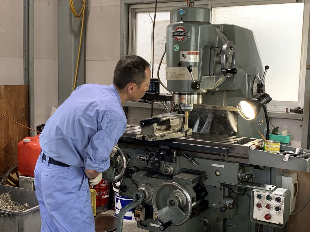 こちらは本社工場に併設されている機械加工室です。フライス盤を使い、ステンレス製品パーツの切削加工を行っています。当工場のフライス盤は、1/1000m単位の精度を出すことが可能。コンピューターで制御しつつ、目視でも切削加工の様子をしっかりと確認します。