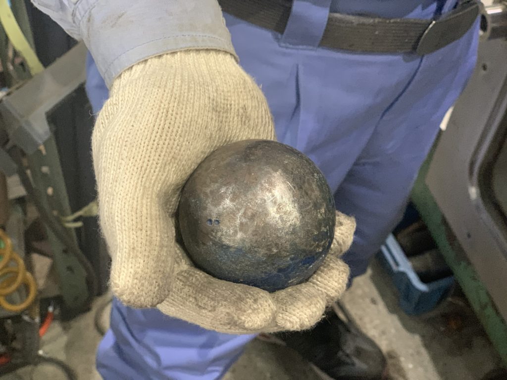 本来は、このような角の加工には鉄球という工具を使用します。今回の加工では、鉄球のサイズが合わなかったため、鉄アレーで代用しました。しかし、鉄アレーは金属加工用につくられたものではないので強度が低く、加工後に持ち手部分が取れてしまいました。