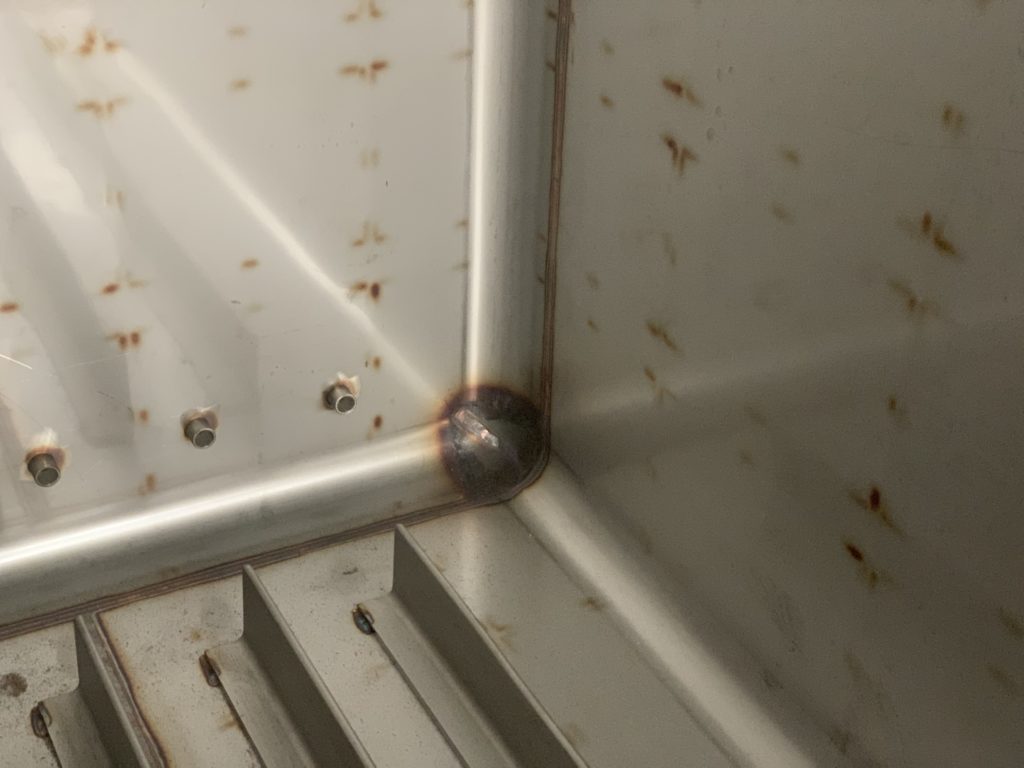 角の部分を真空チャンバーの外側から見るとこのようになっています。鉄アレーを使って加工する前は、こちらの継ぎ目部分が尖っていました。