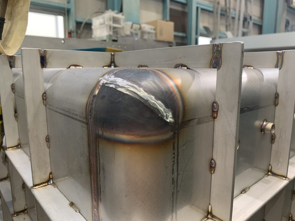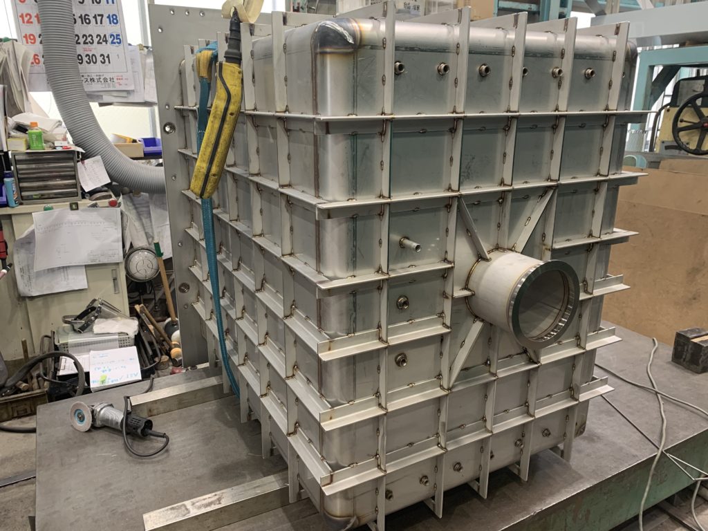 現在製作中のステンレス製真空チャンバーがこちら。急速冷凍機用の内部に設置するものです。高さ1100mm×幅900mm×奥行き1100mmと比較的大きなサイズで、本社工場内でも圧倒的な存在感を放っています。
