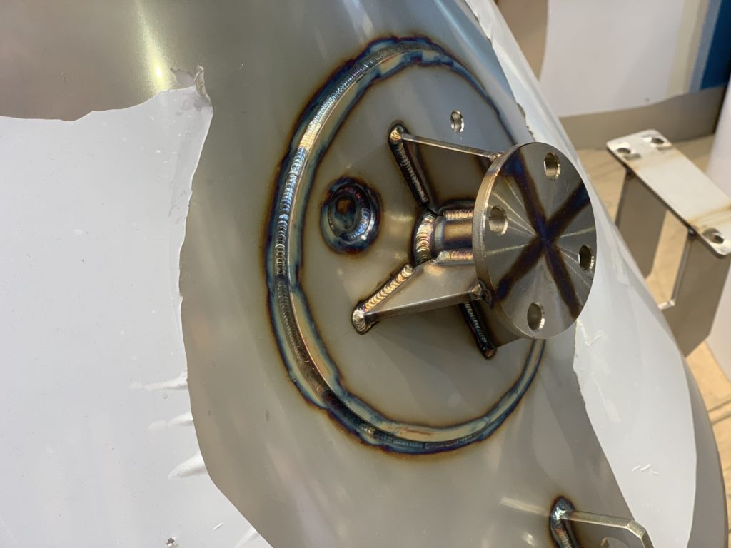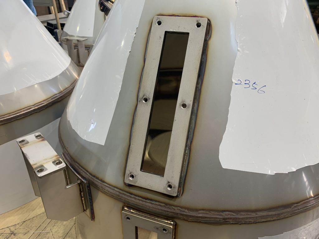 こちらのステンレスホッパーには、長方形ののぞき窓がつけられています。これは、ホッパー内部に粉末状の材料がどの程度残っているかを確認するための窓です。ホッパーに長方形の穴をあけ、外側には窓フランジを取り付けます。ホッパーの内側と外側両方から、しっかりと溶接を行いました。