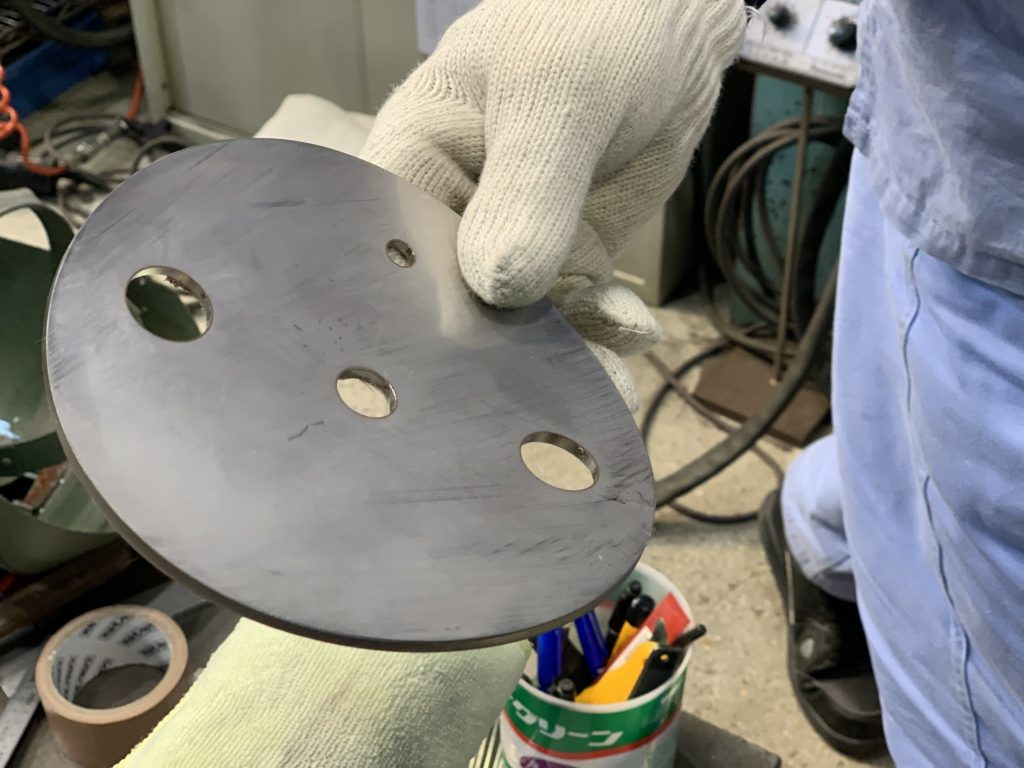 こちらはノッカー座です。ノッカーは、ホッパー内の粉体の付着防止と払い落しのための装置です。ノッカーが当たる場所を補強するために、ホッパーの外側にノッカー座を取り付けます。